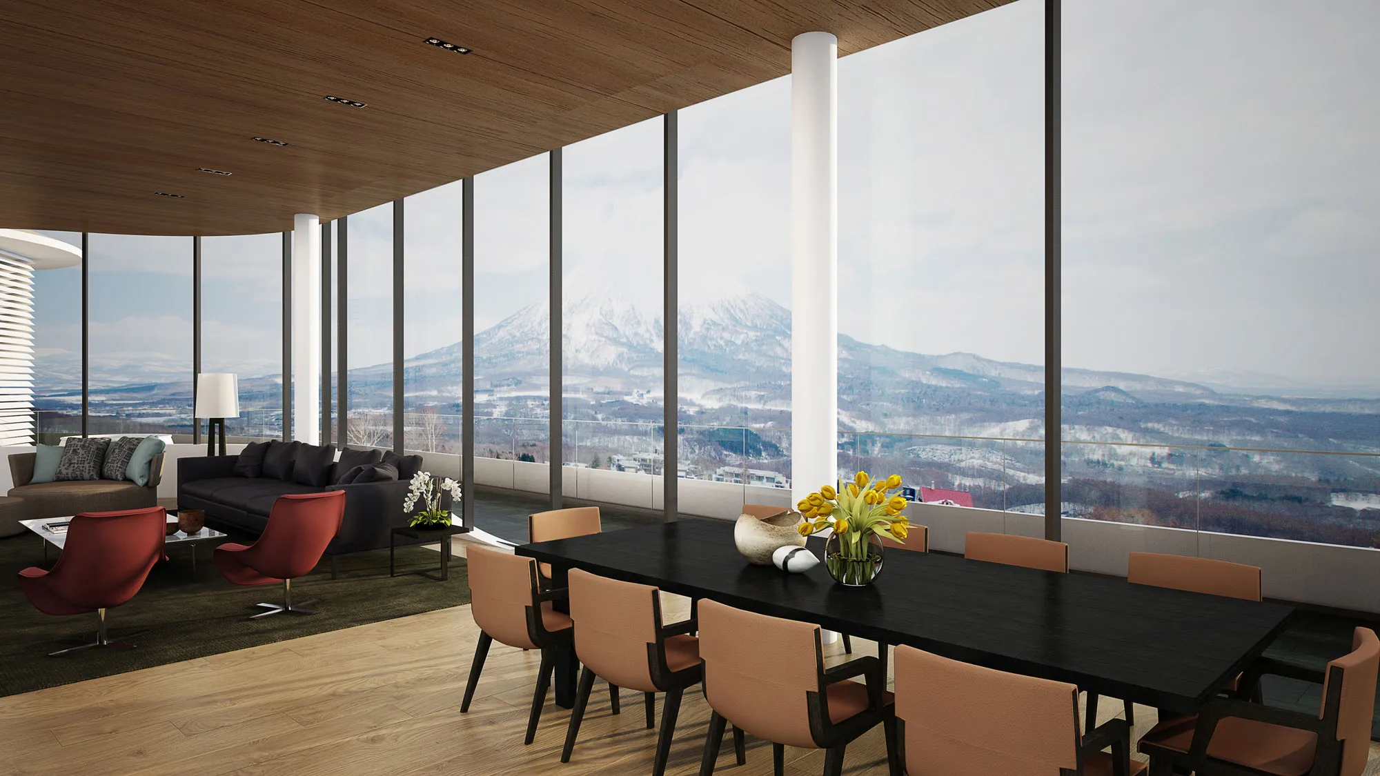 North is a 4 bedroom, 4 bathroom Penthouse which boasts stunning views through its 4-meter glass windows over the village, ski slopes and beyond to Kutchan. The property can be customized with the developer to the taste of the individual buyer.